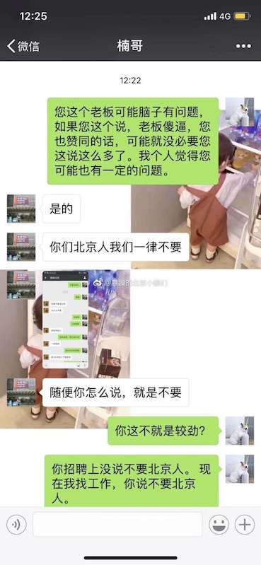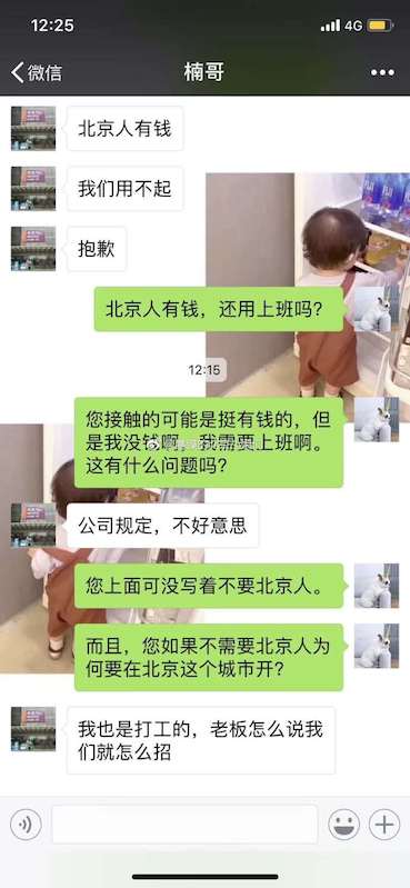 細(xì)看微信聊天記錄,盒馬鮮生負(fù)責(zé)招聘工作的“田經(jīng)理”在與求職者交談中“我們不要本地人”、“你們北京人我們一律不要”等言論,已經(jīng)確定無疑地構(gòu)成地域歧視,證據(jù)確鑿、不容抵賴。而且,無論“田經(jīng)理”是盒馬鮮生的正式員工,還是盒馬鮮生在微博所稱的“第三方勞務(wù)合作公司的兼職員工”,“田經(jīng)理”在招聘過程中都是代表盒馬鮮生這一用人主體,系履行職務(wù)行為而非其個人行為,其行為的后果當(dāng)然由盒馬鮮生承擔(dān)。再者說,作為一名理性的公眾,我更愿意相信,盒馬鮮生內(nèi)部確有“北京人我們一律不要”的規(guī)定,“田經(jīng)理”不過是遵照公司的規(guī)定行事而已。