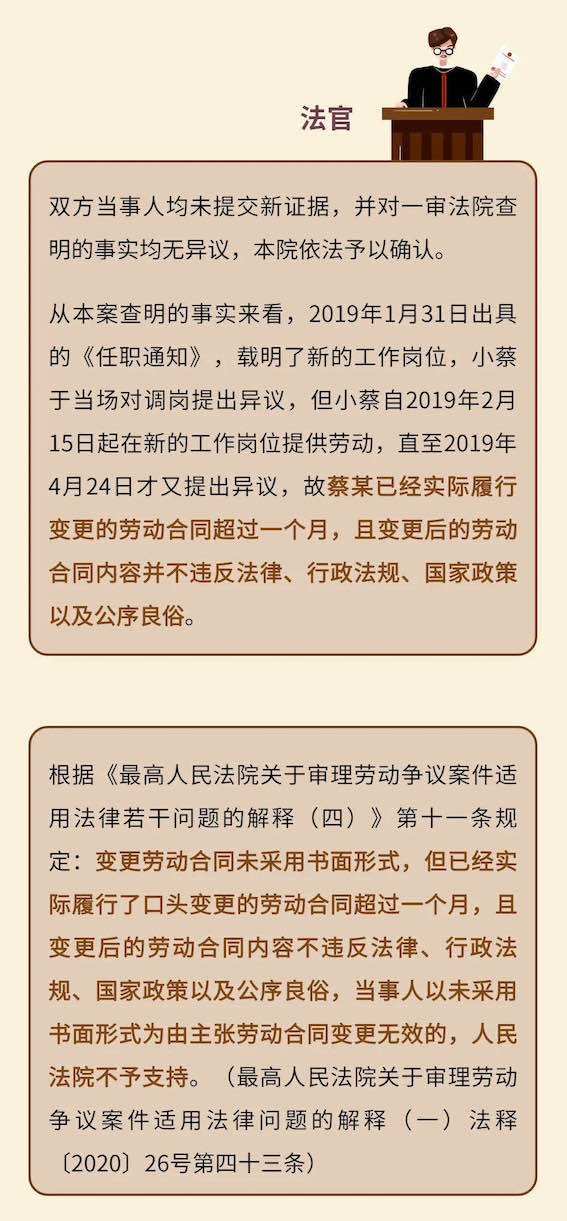 第四十三條 用人單位與勞動者協商一致變更勞動合同,雖未采用書面形式,但已經實際履行了口頭變更的勞動合同超過一個月,變更后的勞動合同內容不違反法律、行政法規且不違背公序良俗,當事人以未采用書面形式為由主張勞動合同變更無效的,人民法院不予支持。 |