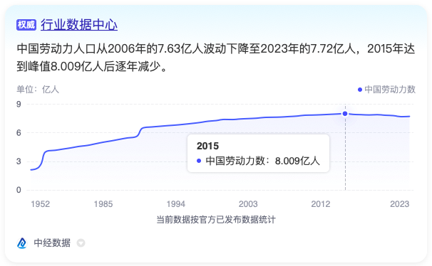 根據統計數據,我國的勞動力人口在2015年達到峰值8.008億人后,基本上呈現逐年減少的趨勢。