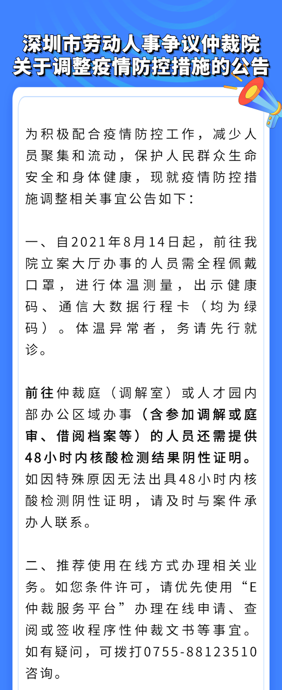 深圳市勞動人事爭議仲裁院關(guān)于調(diào)整疫情防控措施的公告(二)(2021-08-30)