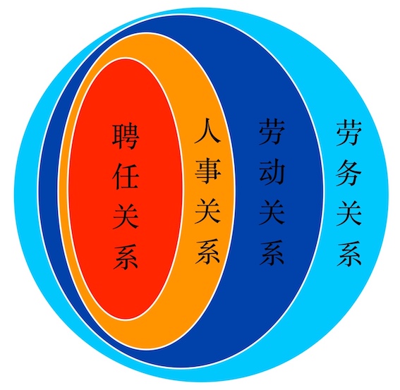 總的來說,這四類用工關系之間是大圓圈和小圓圈之間的關系(如下圖)。在關系認定上遵循這樣一種依次遞進的邏輯:能認定為聘任關系的,認定為聘任關系;能認定為人事關系的,認定為人事關系;能認定為勞動關系的,認定為勞動關系;其余無法歸類的用工關系,通常就按勞務關系認定。從這個意義上來說,勞務關系其實是對無法歸類的用工關系兜底性的統稱。